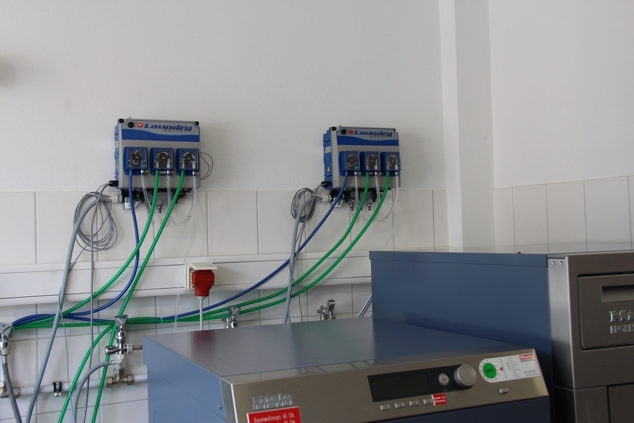 Wir haben uns eine hochwertige Dosieranlage für unsere Waschmaschinen angeschafft. Hierdurch erzielen wir ein noch besseres Ergebnis bei der Reinigung unserer Wischbezüge, da verschiedene Reinigungsmittel optimal abgestimmt auf das Reinigungsprogramm und die unterschiedlichen Mengen dosiert werden. Das bedeutet unter anderem auch eine wesentlich geringere Menge an Reinigungsmittel, was der Umwelt zu Gute kommt.